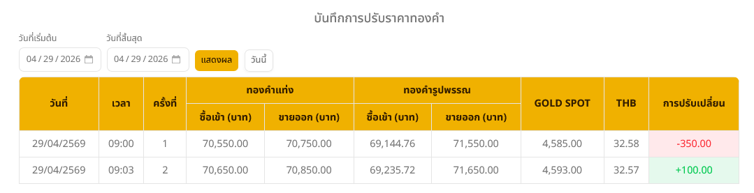 อ่านข่าวต้นฉบับ: ราคาทองวันนี้ (29 เม.ย. 69) ปรับลง 250 บาท รูปพรรณบาทละ 71,650 บาท